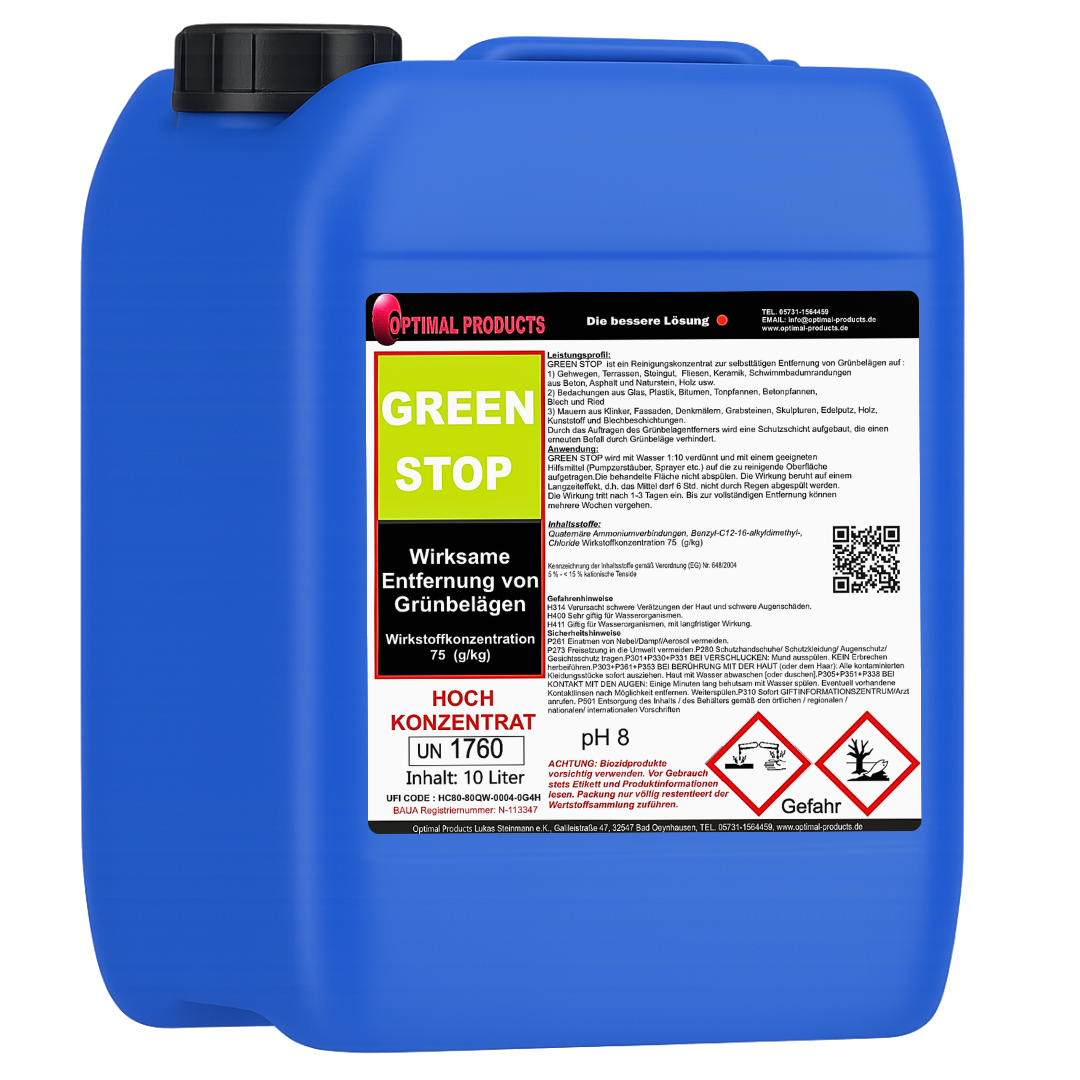 - GREEN STOP Grünbelagentferner ist gebrauchsfertig, kann aber auch mit Wasser verdünnt werden. Abhängig der Stärke des Befalls.