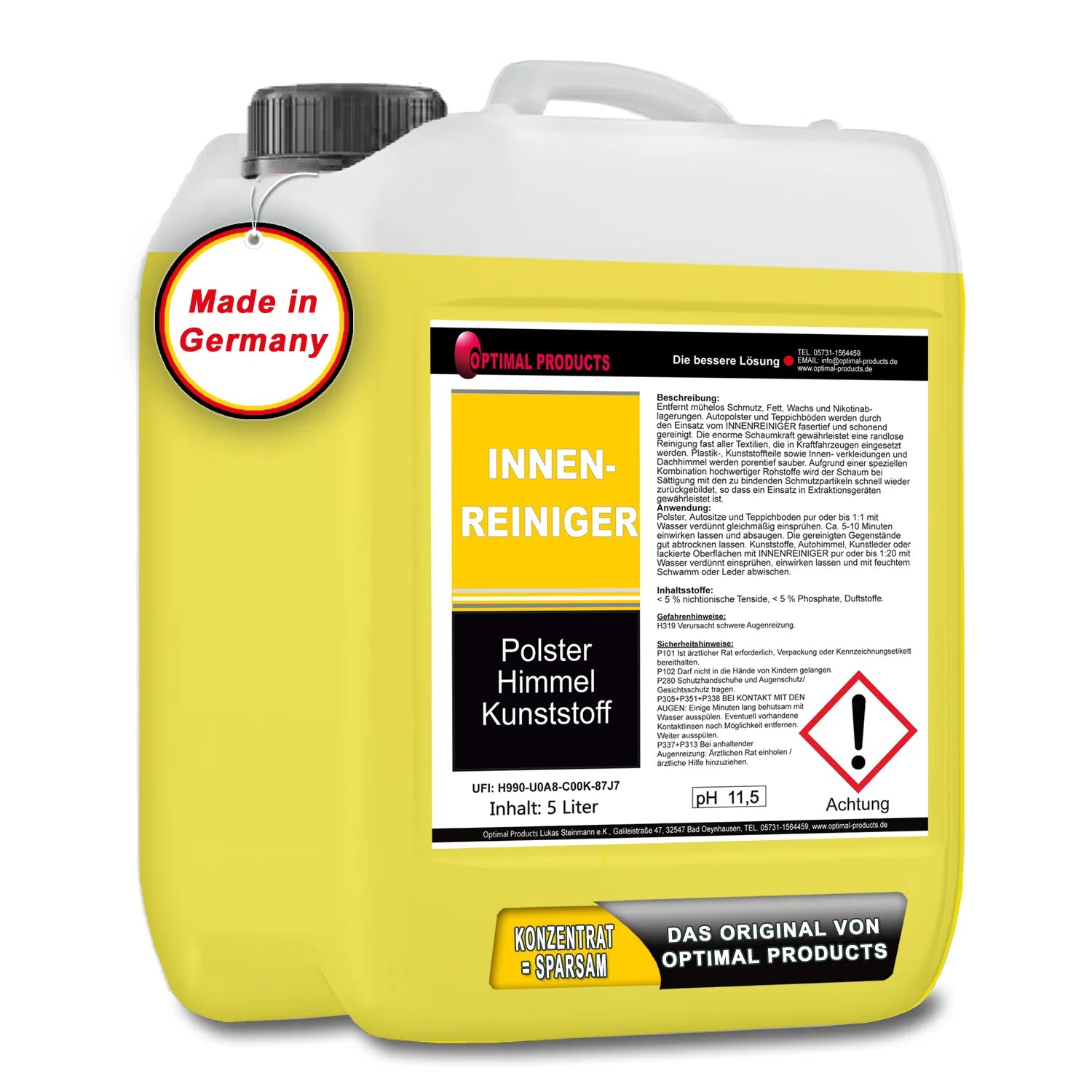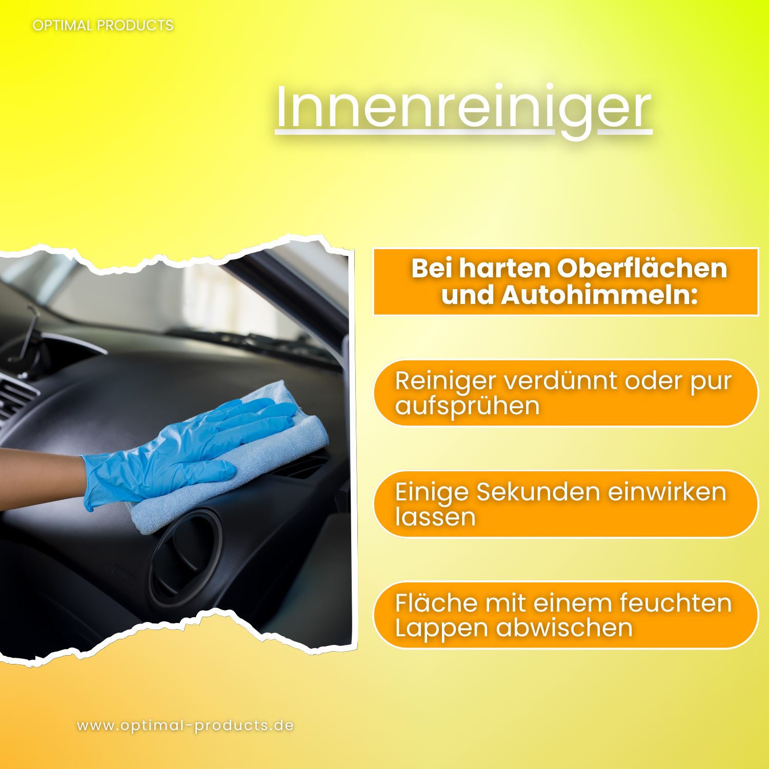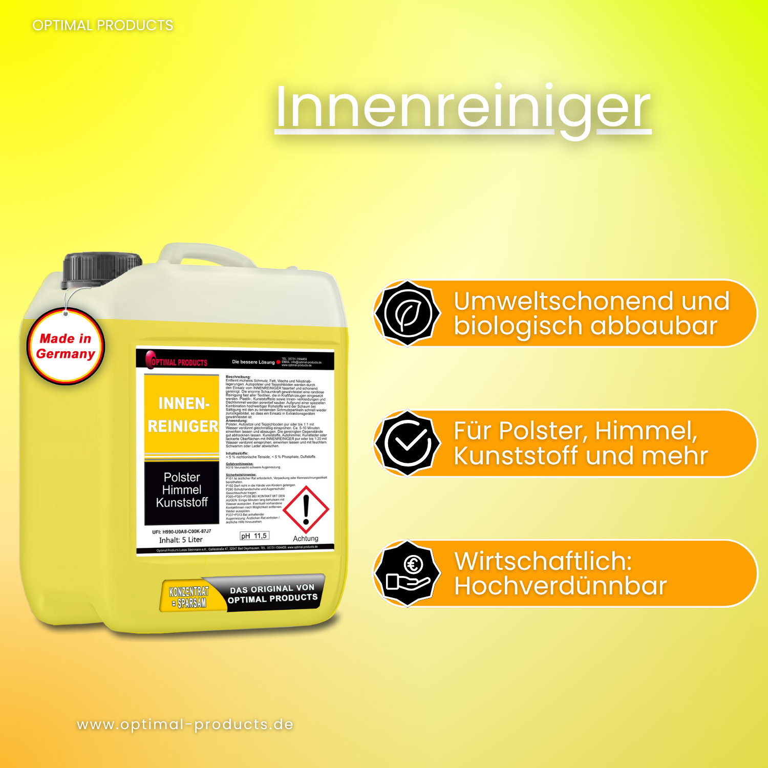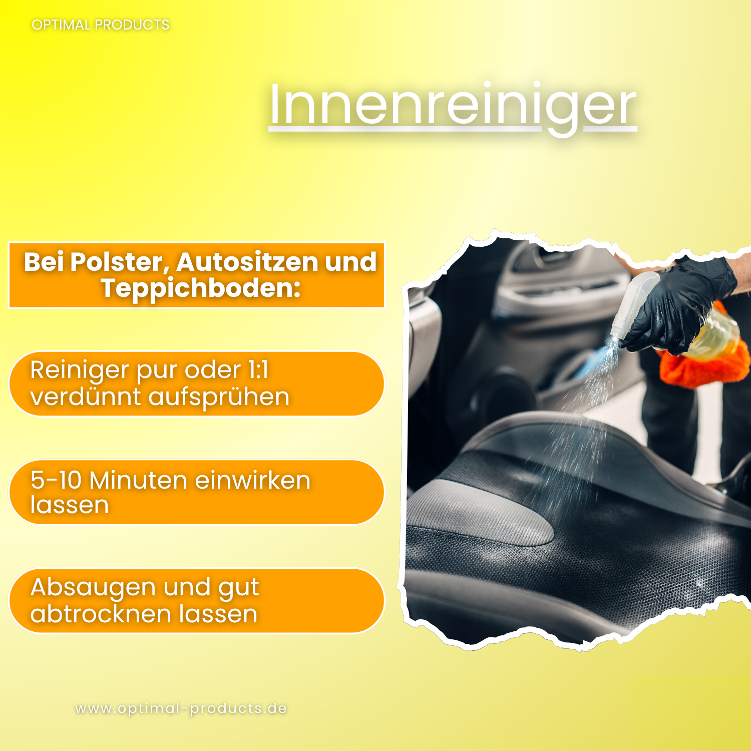 Der INNENREINIGER ist ein schonender alkalischer Reiniger. Er entfernt mühelos Verschmutzungen und Ablagerung auf Textilien wie Polstern und Teppichböden, sowie an Kunststoffteilen.