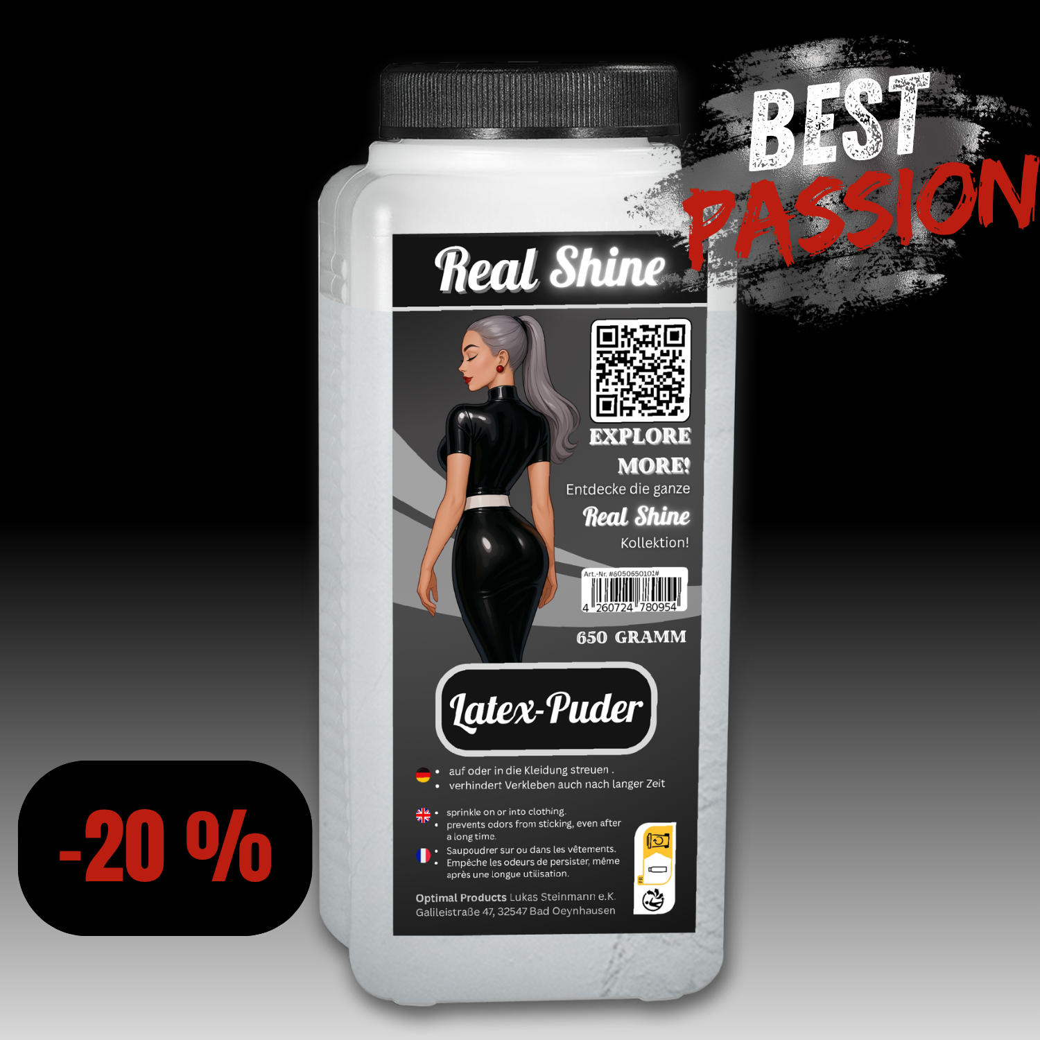 Durch das einfache aufstreuen des Real Shine Latex-Puders ist das verkleben der Latexkleidung auch bei langen Lagerzeiten fast ausgeschlossen. Durch einfaches abbürsten oder mit einem feuchten Lappen können Sie das Talkum leicht wieder von der Kleidung entfernen, sobald Sie es wieder tragen möchten.